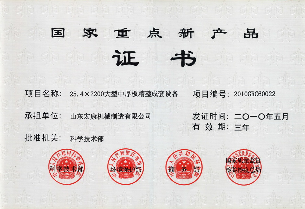 我公司研制的“25.4X2200大型中厚板精整成套设备”被科学技术部、环境保护部、商务部、国家质量监督检验检疫总局联合认定为国家重点新产品。
